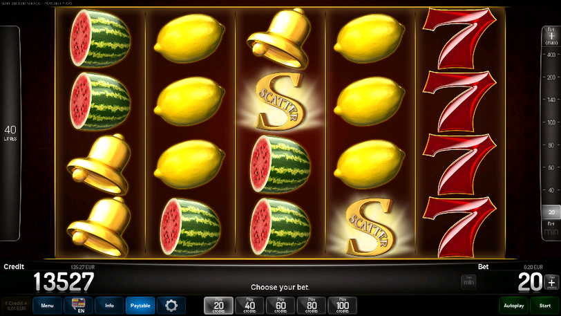 Alle Preise sind für Kombinationen gleicher Art. Alle Preise sind für Kombinationen von links nach rechts, beginnend bei der Walze ganz links, ausgenommen Scatter Scatter zahlt auf jeder Position der Walze. Alle Preise sind auf den gewählten Linien, ausgenommen Scatter. Nur der höchste Gewinn pro gewählter Linie zahlt. Nur der höchste Gewinn pro Scatter-Kombination zahlt. Wild ersetzt alle Symbole außer Scatter. Wild erscheint auf der 2., 3. und 4. Walze. Scatter-Gewinne werden zu den Linien-Gewinnen addiert. Maximaler Gewinn ist limitiert auf € 10.000,-. Kredite können mit der Funktionalität “Kredit anzeigen”, unter der Schaltfläche “Einstellungen” angezeigt oder versteckt werden. Mit den Easy-Bet-Tasten haben Sie die Möglichkeit, ein Spiel sofort mit dem angezeigten Einsatz zu starten. Die Spielerbeteiligung hat keinerlei Einfluss auf das Spielergebnis.
