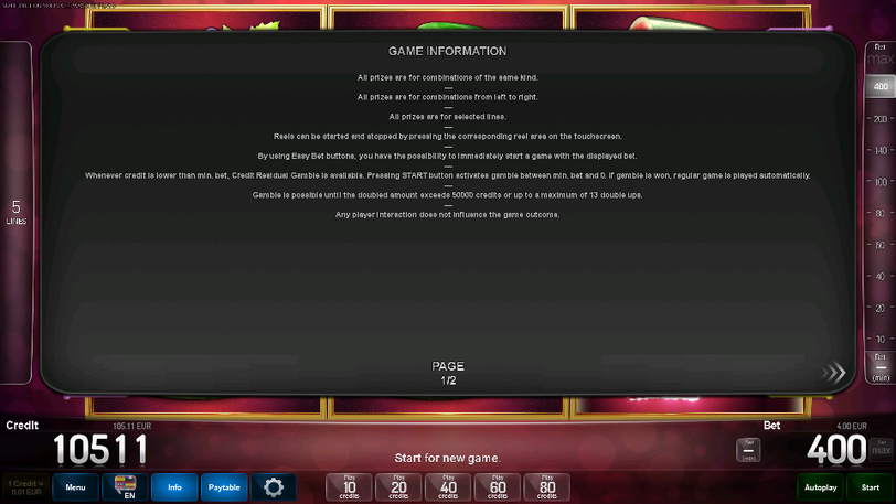 Alle Preise sind für Kombinationen gleicher Art. Alle Preise sind für Kombinationen von links nach rechts, beginnend bei der Walze ganz links. Alle Preise sind auf den gewählten Linien. Maximaler Gewinn ist limitiert auf € 10.000,-. Kredite können mit der Funktionalität “Kredit anzeigen”, unter der Schaltfläche “Einstellungen” angezeigt oder versteckt werden. Mit den Easy-Bet-Tasten haben Sie die Möglichkeit, ein Spiel sofort mit dem angezeigten Einsatz zu starten. Die Spielerbeteiligung hat keinerlei Einfluss auf das Spielergebnis.